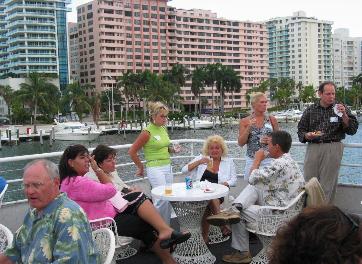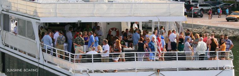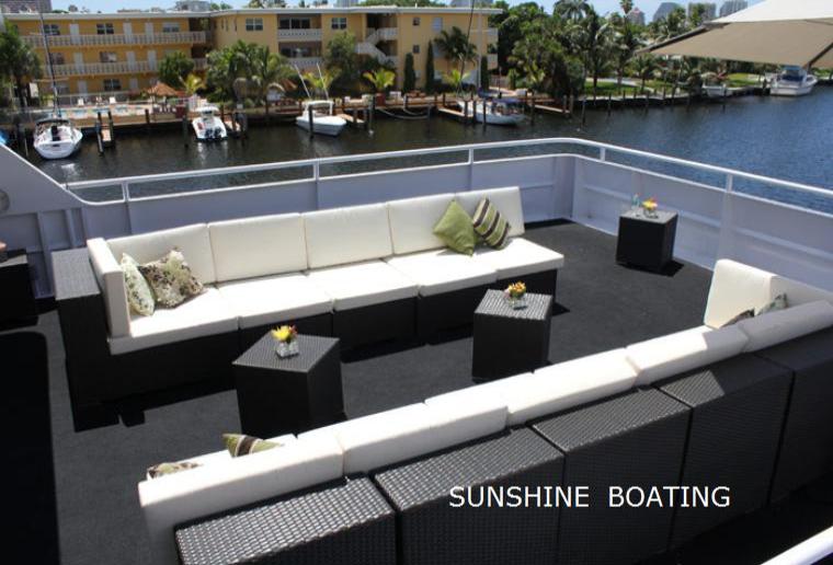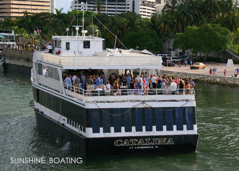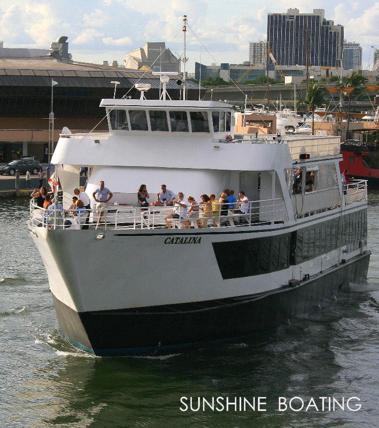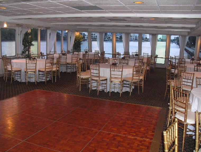 Location: Fort Lauderdale, FL, serving all of South Florida including Palm Beach, Boca Raton, Fort Lauderdale, Miami and Miami Beach. This party yacht offers two large and spacious open and airy decks for entertaining. The tenured crew and wonderful service staff are as exceptional as is the chef and his team that do a wonderful job be it a heavy hors d’oeuvres event, a buffet dinner program or even a sit down dinner. The lower deck is fully climate controlled and features a lounge space with bar, a teak dance floor and dining space for up to 200 guests. Floor to ceiling windows provide stellar views of the passing seascape. A center staircase leads up to the sky deck. The sky deck area is very spacious and features a semi-enclosed bar area, cocktail tables and casual wicker seating. This deck is best in class with room for your entire party to enjoy sightseeing, dancing and mingling. The bow area is very large and offers more seating areas. The service crew will pass hors d’oeuvres and cocktails throughout the yacht so that you can focus on the sights and your guests. Overall, this yacht has a fine balance of tasty cuisine, comfortable spaces and a friendly crew which combine to deliver an outstanding experience at a more attractive price point. Perfect for weddings, birthdays or any other social or corporate affair.