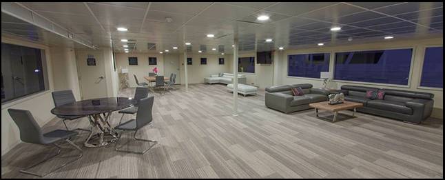 DECK THREE: MAIN LOUNGE Large, open, handsome bar, dancing, an upscale social space for all to enjoy.