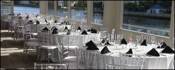 Oval tables, Chivari chairs, glass stemware, finer flatware, china, choice of black, silver or white print linens – standard. 240 seated guests.