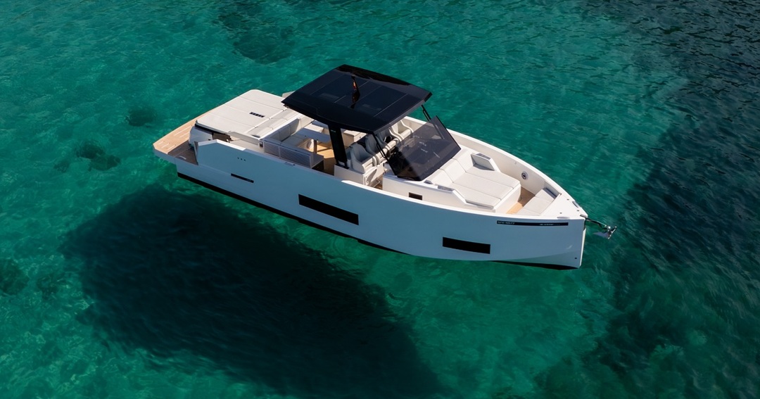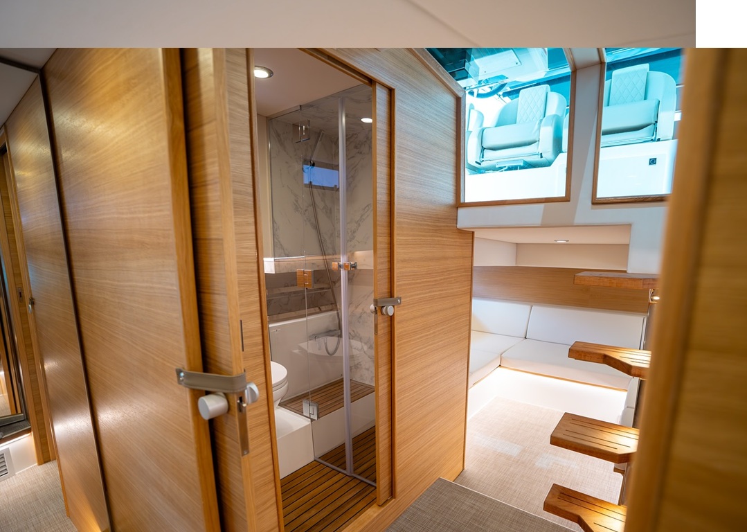 Let’s go cruising now with Sunshine Boating. In our 21-year history, Sunshine Boating has seen many sport yacht models evolve. Some yachts keep the look and feel of their former selves, others have reshaped the market; literally. The de ANTONIO OPEN “D42” is one of the newest concepts in the yachting industry today, and it is spectacular. Topside is open, with cushy comfort forward and aft. Relax up front on the wide club sofa to take in the views of Biscayne Bay. Stretch out and bask in the sunshine across the wide sun pad beds to the rear of this impressive yacht. Sit and enjoy refreshments and tapas around the central U-shaped sofa and expandable tables while being whisked to the sandbar. Hidden below deck is a light but cool oasis of comfort. The main cabin, galley, washroom and shower is complemented with an expansive sofa bed seating area, your own private escape.