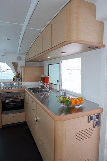 Stainless counter tops compliment this generous galley. A nice feature is the sliding window and patio door which opens the room and connects it with the aft deck into one large continuous space. Lagoon cats have a wonderful flow inside and out.