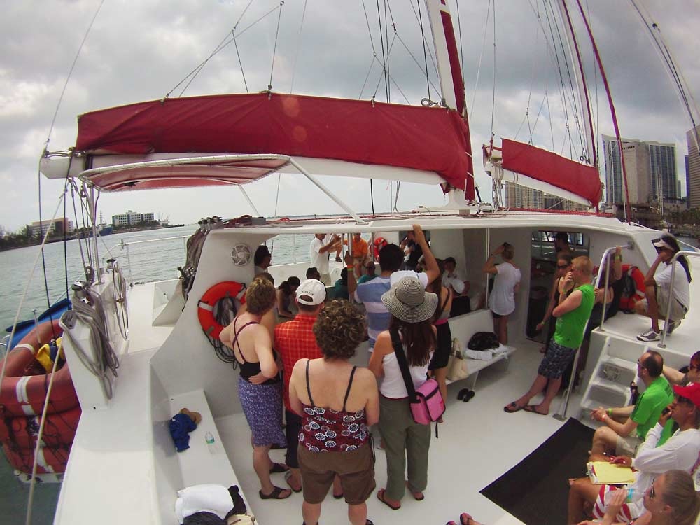 Location: Miami, FL South Florida’s largest sailing catamaran, this 78 footer is licensed and insured for up to 100 guests. Typical charters include ocean sailing, snorkeling, swimming and/or evening cocktail cruises. Enjoy the shade and dine under cover in the expansive salon or stretch out on decks under the sun or stars. Complete with twin trampolines, a centralized bar (snacks / chips, beer and wine, soda and water are included on all charters) and plenty of seating for all guests. We sail with a fully experienced and highly trained marine crew and service staff. She has twin masts, a massive screecher sail as well as motor power to reach specific destinations when needed. This vessel is ideal for water sports activities (snorkeling, water trampoline, sandbar volleyball, floats) for a few hours of wet & wild fun. We also offer full catering services for lunch, dinner or cocktail hors d’oeuvres events. A great value.