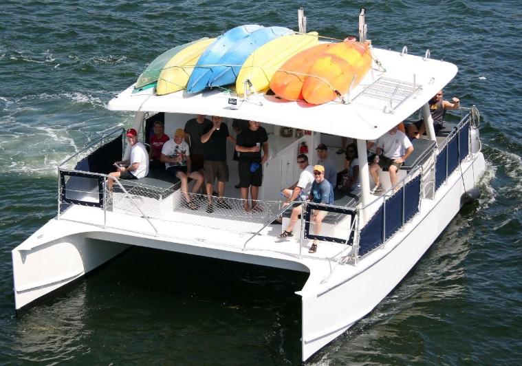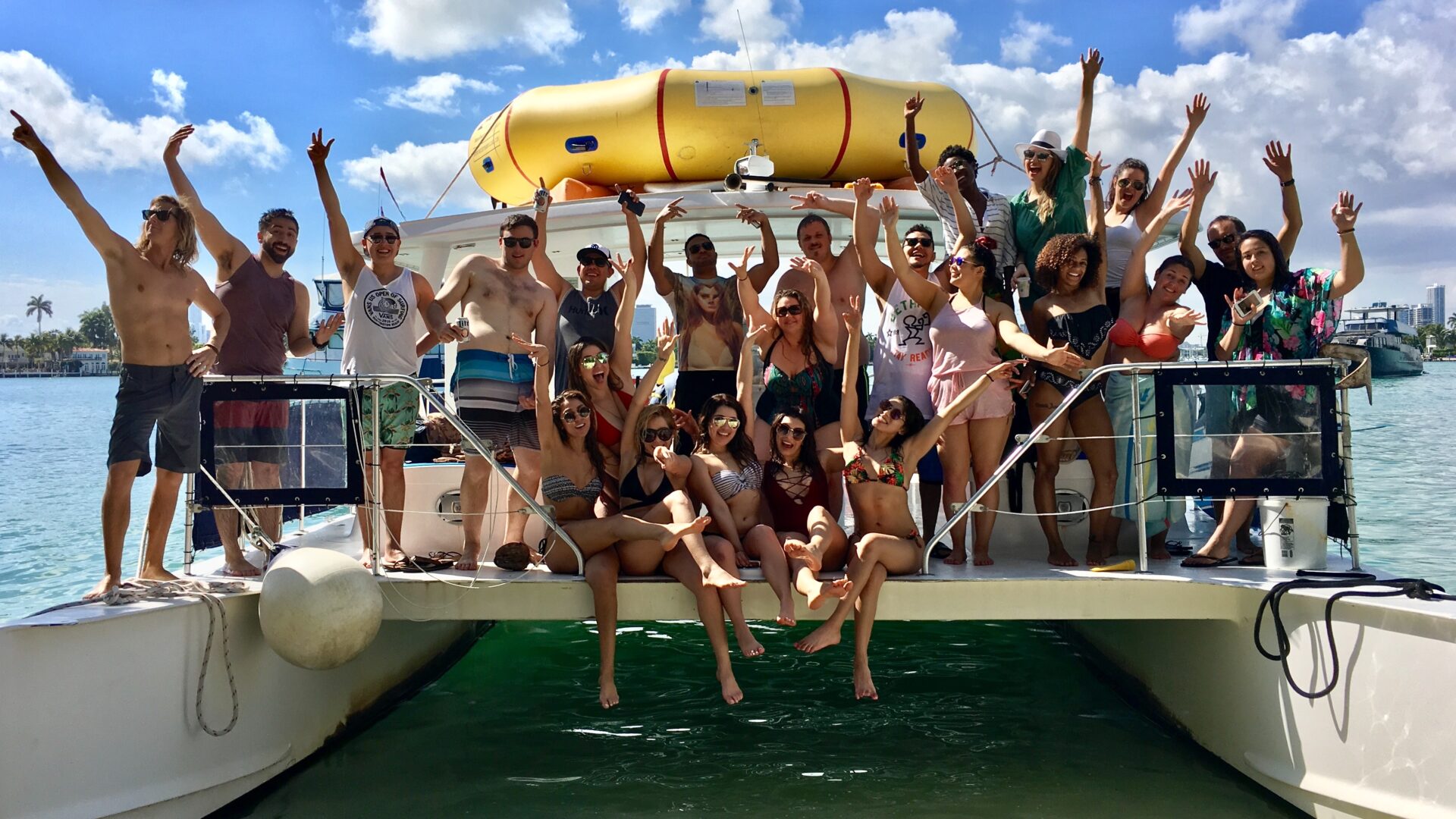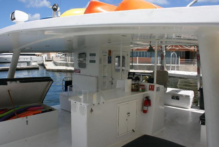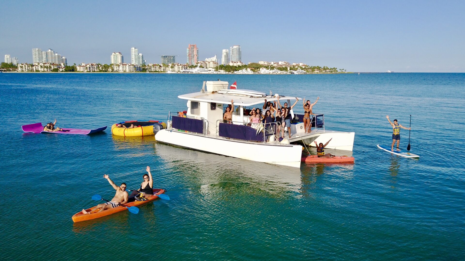 Location: Miami, FL (Downtown). This POWERCAT 40 is a Miami favorite for cruising around the tranquil waters of Miami, Miami Beach, Key Biscayne and the surrounding islands. Certified for a maximum of 30 guests plus our crew, the vessel is ideal for a combined sight-seeing, swimming, snorkeling and ocean kayaking experience. Listen to tropical music, enjoy complimentary beer, wine, soda and bottled water and relax as we cruise to the best locations. This vessel is also great for party cruises, intimate / casual weddings, corporate team building and a family get together boat. She is one of the best options for groups that seek a floating island party at the sandbar. This is our most popular “command vessel” for multiple boat regattas. Want to spice up the event?  She is ADA compliant and features a chair accessible bathroom and lift for getting into and out of the water Full catering is available or you can bring your own ready to eat meals. She truly delivers a fun experience. NO OUTSIDE ALCOHOL PERMITTED. NO JET SKI MEET-UPS.  CATERING OPTIONS AVAILABLE.