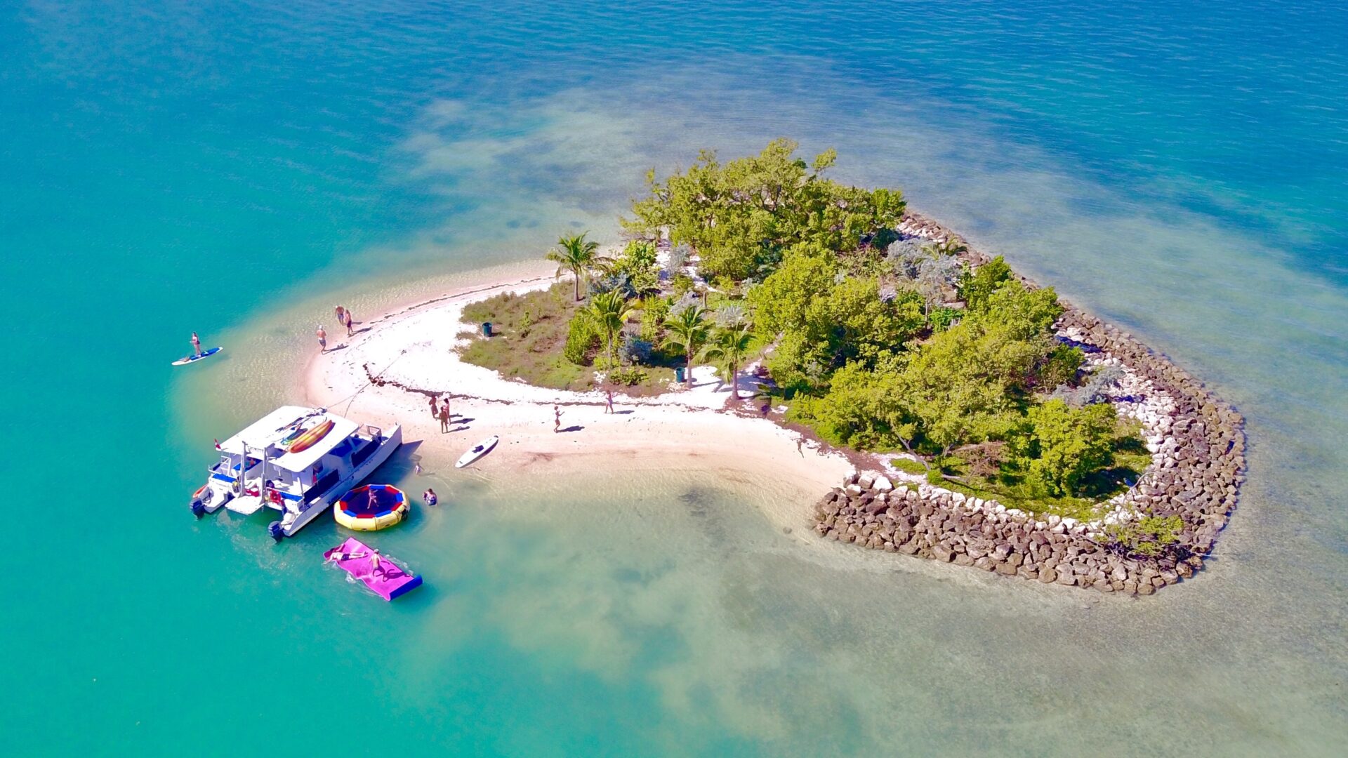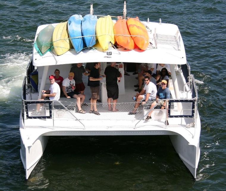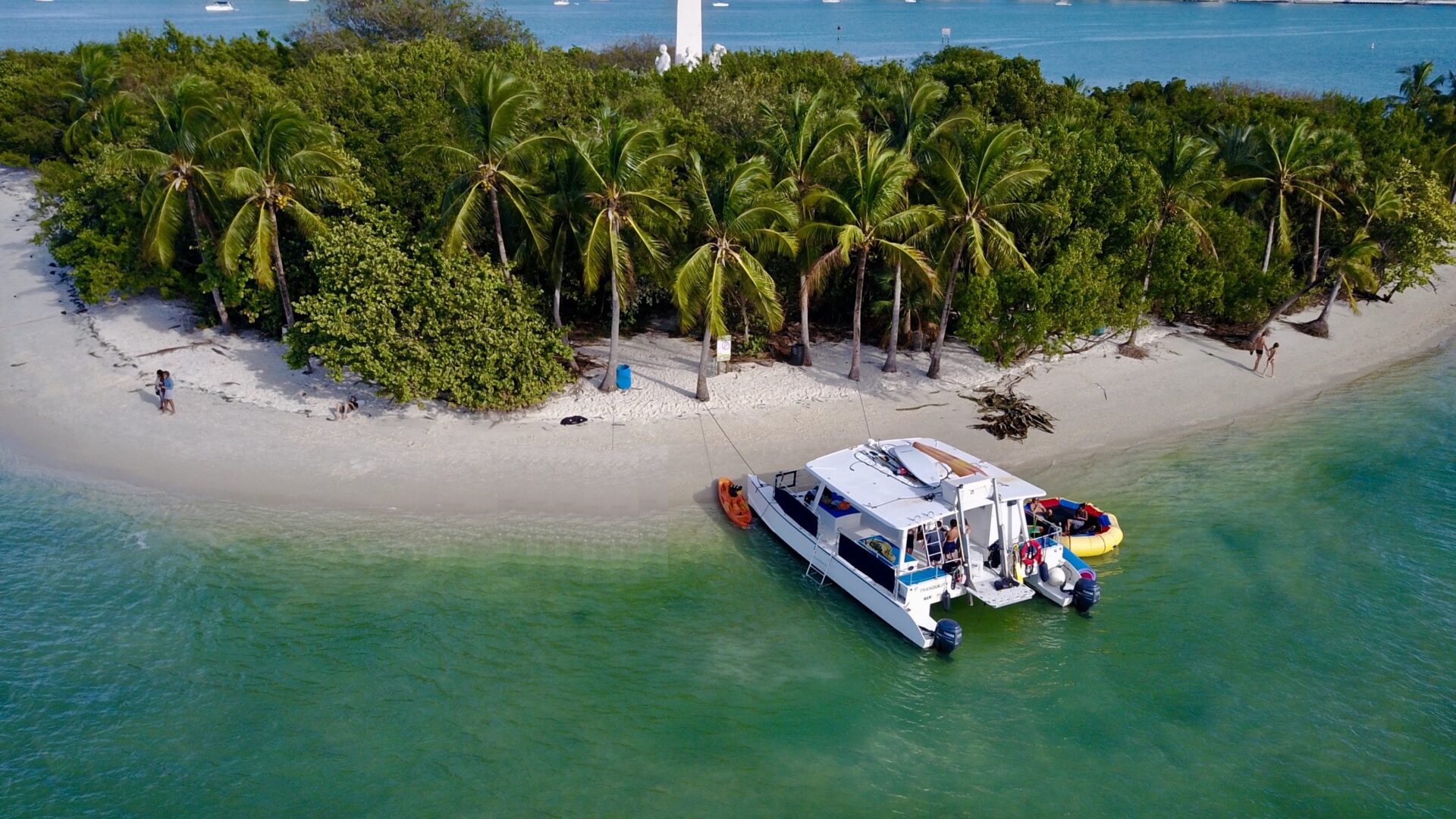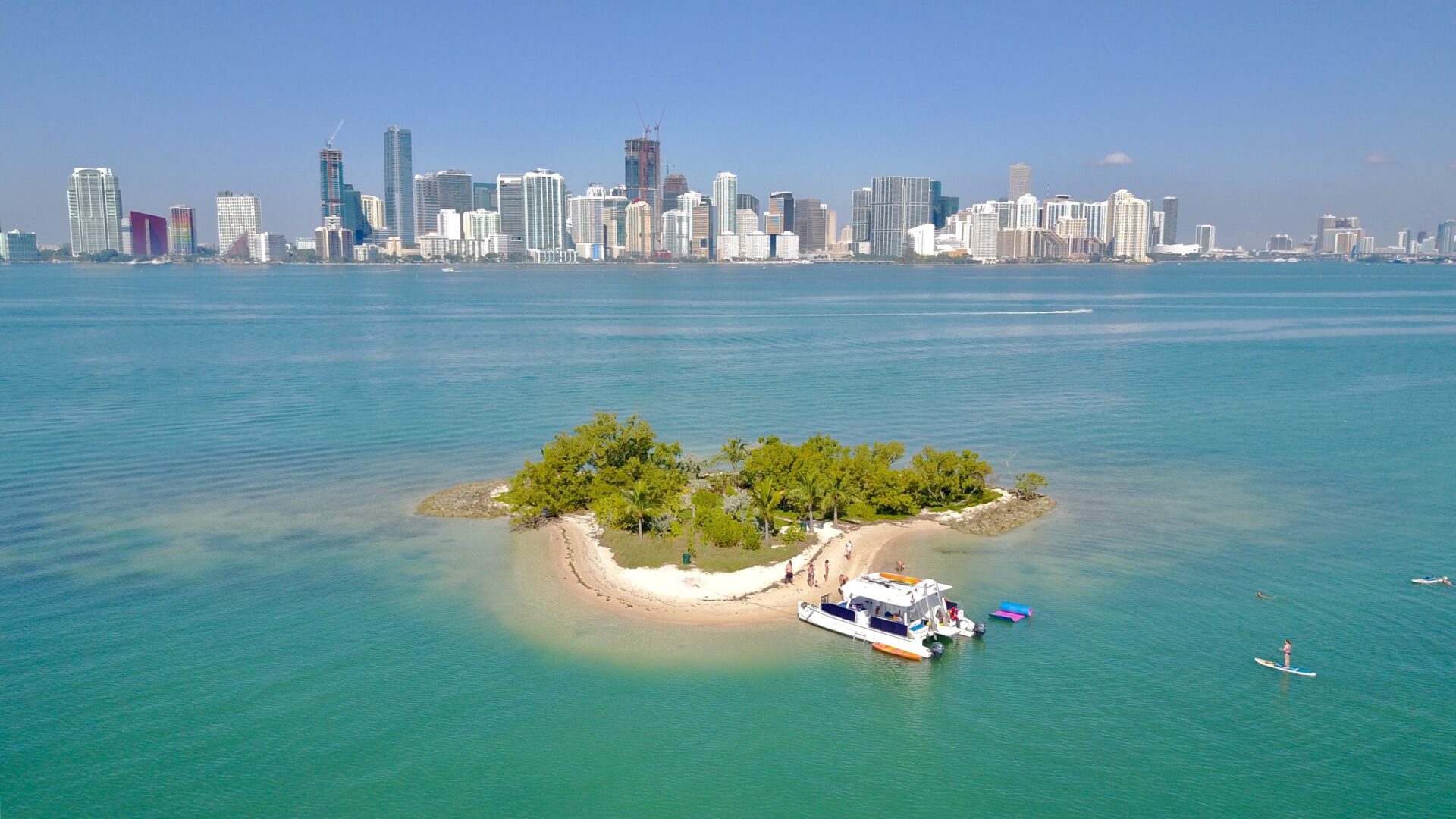 Location: Miami, FL (Downtown). This POWERCAT 40 is a Miami favorite for cruising around the tranquil waters of Miami, Miami Beach, Key Biscayne and the surrounding islands. Certified for a maximum of 30 guests plus our crew, the vessel is ideal for a combined sight-seeing, swimming, snorkeling and ocean kayaking experience. Listen to tropical music, enjoy complimentary beer, wine, soda and bottled water and relax as we cruise to the best locations. This vessel is also great for party cruises, intimate / casual weddings, corporate team building and a family get together boat. She is one of the best options for groups that seek a floating island party at the sandbar. This is our most popular “command vessel” for multiple boat regattas. Want to spice up the event?  She is ADA compliant and features a chair accessible bathroom and lift for getting into and out of the water Full catering is available or you can bring your own ready to eat meals. She truly delivers a fun experience. NO OUTSIDE ALCOHOL PERMITTED. NO JET SKI MEET-UPS.  CATERING OPTIONS AVAILABLE.